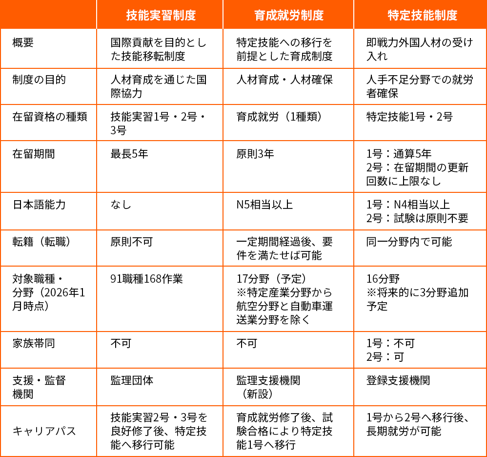 技能実習制度、特定技能制度、育成就労制度の主な違いを比較表にまとめました。