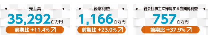 この結果、当期の業績は、売上高362億20百万円(前期比2.6%増)、営業利益12億70百万円(前期比13.5%増)、経常利益は為替差益29百万円等を計上したことから13億円(前期比11.5%増)、親会社株主に帰属する当期純利益は法人税等4億32百万円等を計上し、8憶58百万円(前期比13.3%増)となりました。